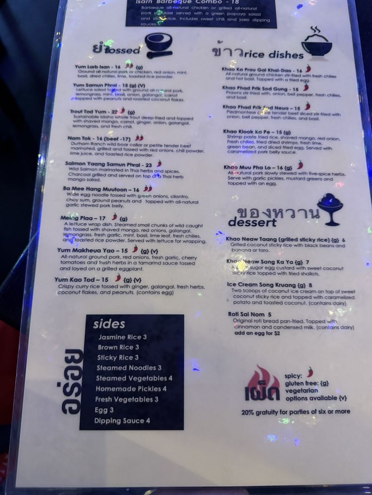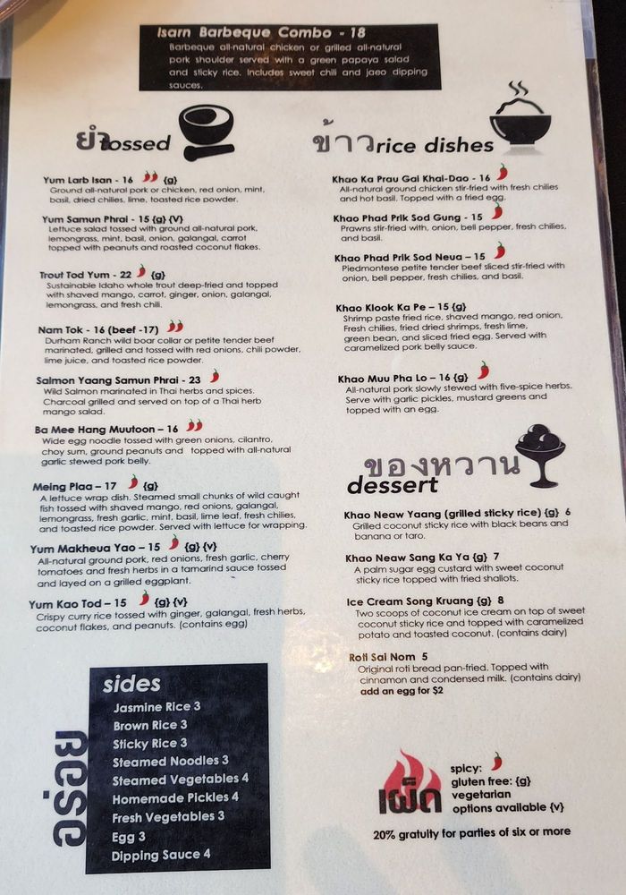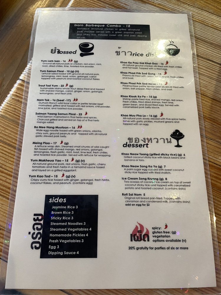 Barbeque all-natural chicken or Grilled Durham Ranch wild boar collar served with sides of papaya salad and sticky rice. Includes sweet chili and jaeo dipping sauces.