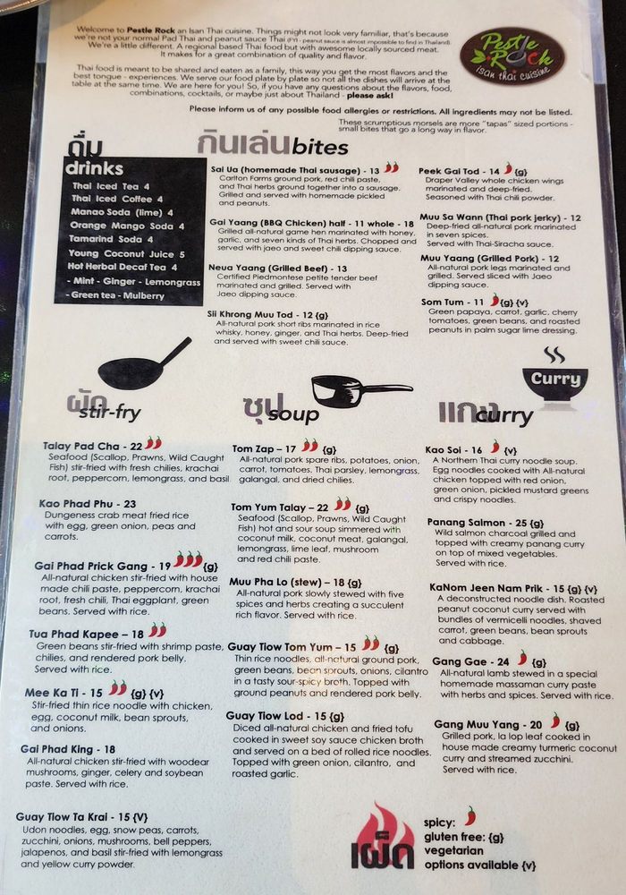 Introducing Pestle Rock, a Thai restaurant in Seattle that offers a unique dining experience with a focus on regional Thai cuisine from the Isan Peninsula. With a cozy ambiance adorned with holiday lights, Pestle Rock caters to those looking for authentic and flavorful Thai dishes. Customers rave about the variety of options, from Isan Barbeque Combo to Khao Ka Prau Gai KhaiDao and Kao Soi curry. The talented chef behind the dishes ensures every bite is a burst of traditional Thai flavors. Reviews mention the speedy service, reasonable prices, and generous portions. Don't miss out on trying Pestle Rock for a memorable dining experience that will leave you craving more.